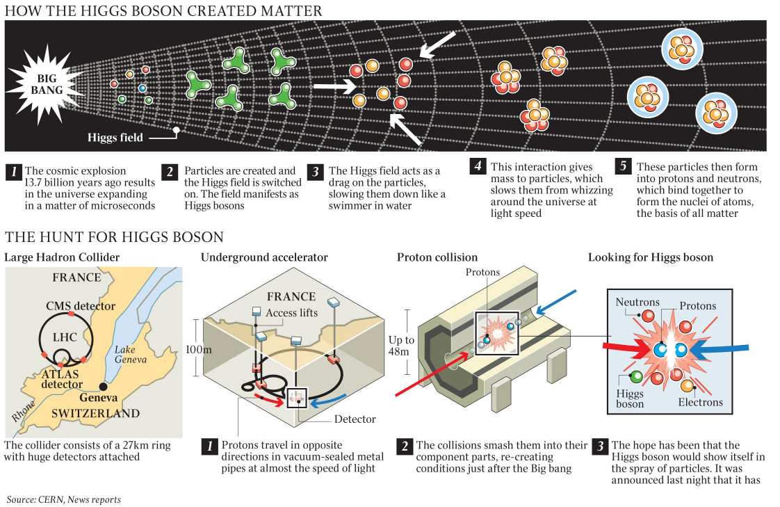 Little wonder the Higgs is called the God particle. Or as Arizona State University cosmologist Paul Davies calls it, the "goddamn particle" because, until now, it had failed to turn up. Getting the goddamn particle to show its spots involved creating subatomic particle collisions. That was the job of the Large Hadron Collider. Built at a cost of $10 billion between 1998 and 2008, it lies beneath the Franco-Swiss border, in a tunnel 27km in circumference, as deep as 175m. It hurtles beams of subatomic particles — part of the nuclei of atoms — into one another at phenomenally high speed.
